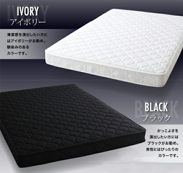 【サイズ】 セミダブル:幅120×長さ195×高さ16cm 【材質】 2.2mmボンネルコイルスプリング(コイル数/SD:448) ウレタンフォーム、ポリエステル100%張り地、両面多針キルティング加工 【重量】 セミダブル:約24kg 【生産国】 中国 【カラー】 アイボリー、ブラック 【梱包サイズ】 セミダブル:44×44×121cm 布団・マットレスはこちら 布団・マットレスカテゴリではさまざまな布団やマットレスをご覧いただけます。